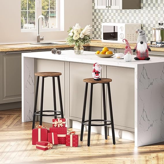 Boroque Set of 2 Bar Chairs, Kitchen Round Height Stools with Footrest, Breakfast Bar Stools, Sturdy Steel Frame, for Dining Room, Kitchen, Party, Easy Assembly, Rustic Brown